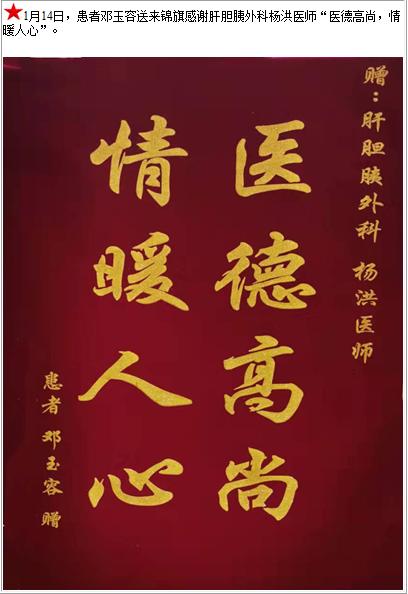 患者邓玉容送来锦旗感谢肝胆胰外科杨洪医师“医德高尚,情暖人心”-锦旗-患者心声-患者服务-重庆医科大学附属第三医院【官方网站】