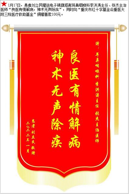 患者刘立民赠送电子锦旗感谢耳鼻咽喉科李洪涛主任等人,并向医疗救助基金捐赠善款100元-锦旗-患者心声-患者服务-重庆医科大学附属第三医院【官方网站】