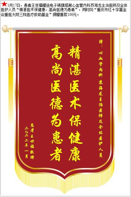 患者王世福赠送电子锦旗感谢心血管内科苏海龙主治医师及全体医护人员,并向医疗救助基金捐赠善款100元-锦旗-患者心声-患者服务-重庆医科大学附属第三医院【官方网站】