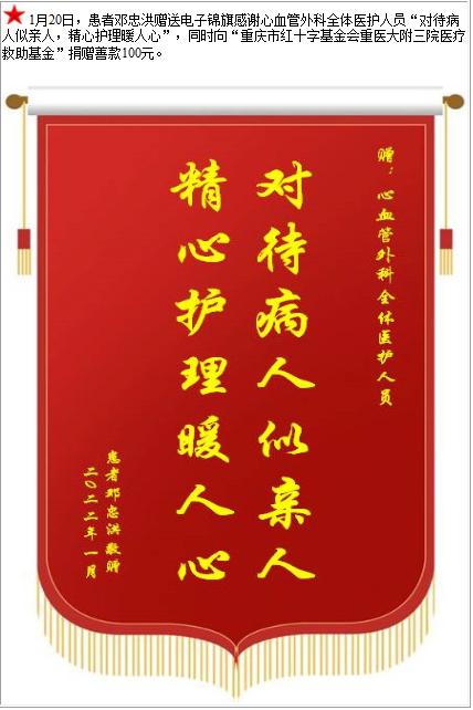 患者邓忠洪赠送电子锦旗感谢心血管外科全体医护人员,并向医疗救助基金捐赠善款100元-锦旗-患者心声-患者服务-重庆医科大学附属第三医院【官方网站】