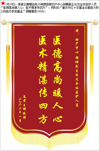 患者王娜赠送电子锦旗感谢妇产中心胡珊副主任及全体医护人员,并向医疗救助基金捐赠善款100元-锦旗-患者心声-患者服务-重庆医科大学附属第三医院【官方网站】