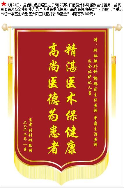 患者张锡超赠送电子锦旗感谢肝胆胰外科郭鹏副主任医师等人及全体护体人员,并向医疗救助基金捐赠善款100元-锦旗-患者心声-患者服务-重庆医科大学附属第三医院【官方网站】