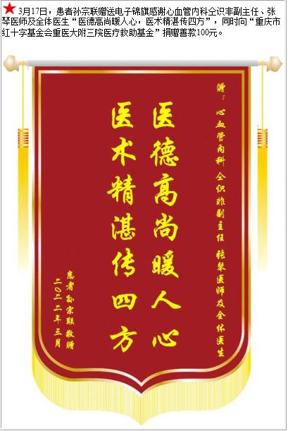 患者孙宗联赠送电子锦旗感谢心血管内科仝识非副主任等人,并向医疗救助基金捐赠善款100元-锦旗-患者心声-患者服务-重庆医科大学附属第三医院【官方网站】