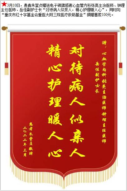 患者朱堂贞赠送电子锦旗感谢心血管内科张亮主治医师等人,并向医疗救助基金捐赠善款100元-锦旗-患者心声-患者服务-重庆医科大学附属第三医院【官方网站】