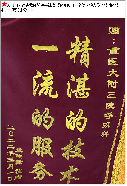 患者孟隆禄送来锦旗感谢呼吸内科全体医护人员“精湛的技术,一流的服务”-锦旗-患者心声-患者服务-重庆医科大学附属第三医院【官方网站】