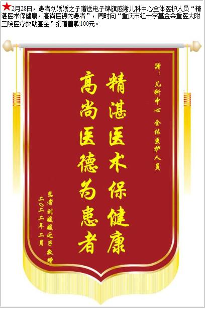 患者刘媛媛之子赠送电子锦旗感谢儿科中心全体医护人员,并向医疗救助基金捐赠善款100元-锦旗-患者心声-患者服务-重庆医科大学附属第三医院【官方网站】