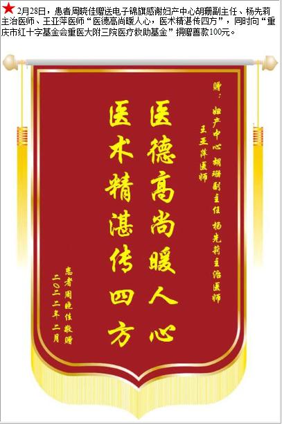 患者周晓佳赠送电子锦旗感谢妇产中心胡珊副主任等人,并向医疗救助基金捐赠善款100元-锦旗-患者心声-患者服务-重庆医科大学附属第三医院【官方网站】