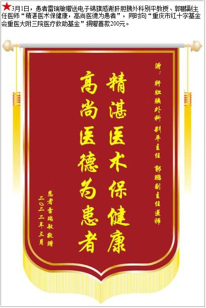 患者雷瑞敏赠送电子锦旗感谢肝胆胰外科别平教授等人,并向医疗救助基金捐赠善款200元-锦旗-患者心声-患者服务-重庆医科大学附属第三医院【官方网站】
