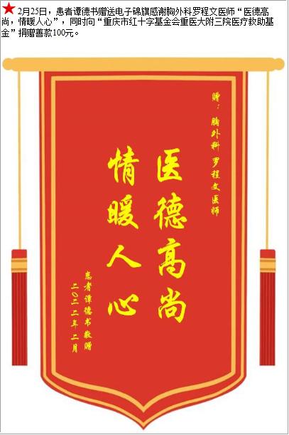 患者谭德书赠送电子锦旗感谢胸外科罗程文医师,并向医疗救助基金捐赠善款100元-锦旗-患者心声-患者服务-重庆医科大学附属第三医院【官方网站】