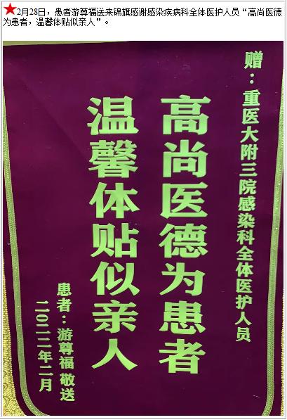 患者游尊福送来锦旗感谢感染疾病科全体医护人员“高尚医德为患者,温馨体贴似亲人”-锦旗-患者心声-患者服务-重庆医科大学附属第三医院【官方网站】