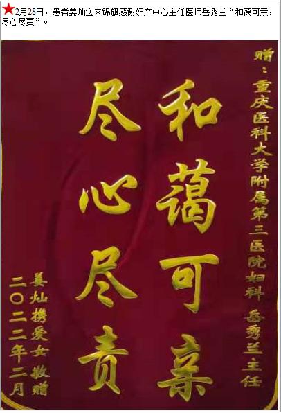 患者姜灿送来锦旗感谢妇产中心主任医师岳秀兰“和蔼可亲,尽心尽责”-锦旗-患者心声-患者服务-重庆医科大学附属第三医院【官方网站】