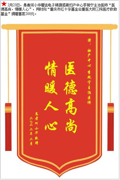 患者何小华赠送电子锦旗感谢妇产中心李艳宁主治医师,并向医疗救助基金捐赠善款200元-锦旗-患者心声-患者服务-重庆医科大学附属第三医院【官方网站】