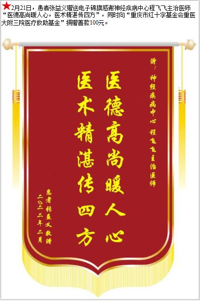 患者张益义赠送电子锦旗感谢神经疾病中心程飞飞主治医师,并向医疗救助基金捐赠善款100元-锦旗-患者心声-患者服务-重庆医科大学附属第三医院【官方网站】