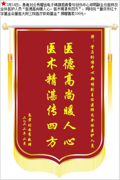 患者刘云秀赠送电子锦旗感谢骨与创伤中心郑明副主任医师及全体医护人员,并向医疗救助基金捐赠善款100元-锦旗-患者心声-患者服务-重庆医科大学附属第三医院【官方网站】
