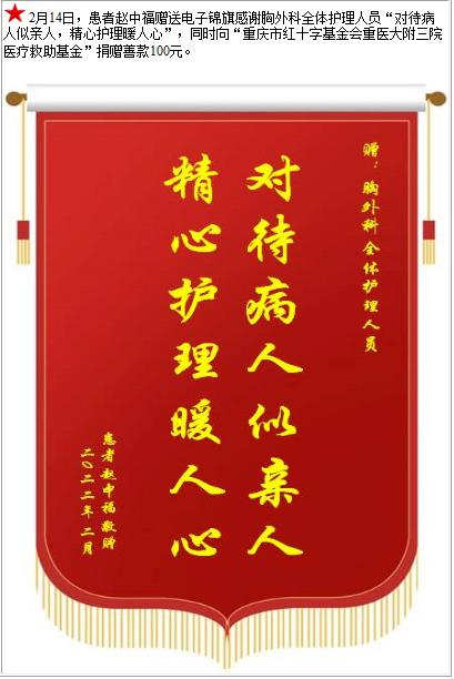 患者赵中福赠送电子锦旗感谢胸外科全体护理人员,并向医疗救助基金捐赠善款100元-锦旗-患者心声-患者服务-重庆医科大学附属第三医院【官方网站】