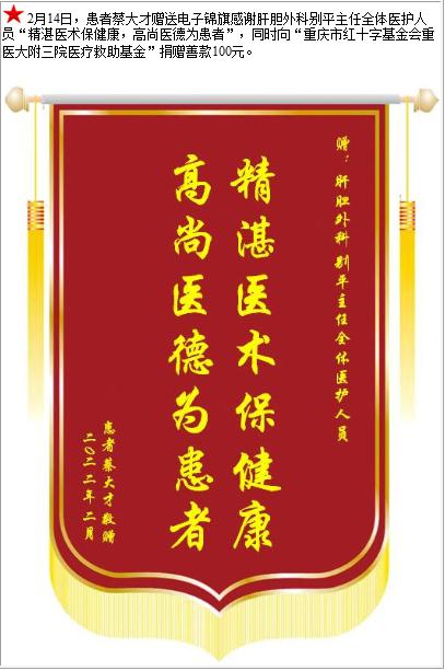 患者蔡大才赠送电子锦旗感谢肝胆外科别平主任全体医护人员,并向医疗救助基金捐赠善款100元-锦旗-患者心声-患者服务-重庆医科大学附属第三医院【官方网站】