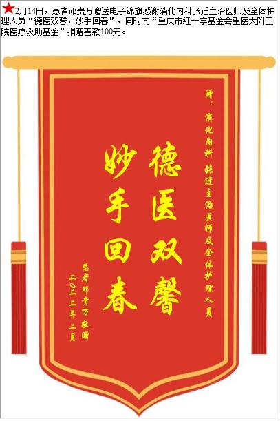 患者邓贵万赠送电子锦旗感谢消化内科张迁主治医师及全体护理人员,并向医疗救助基金捐赠善款100元-锦旗-患者心声-患者服务-重庆医科大学附属第三医院【官方网站】