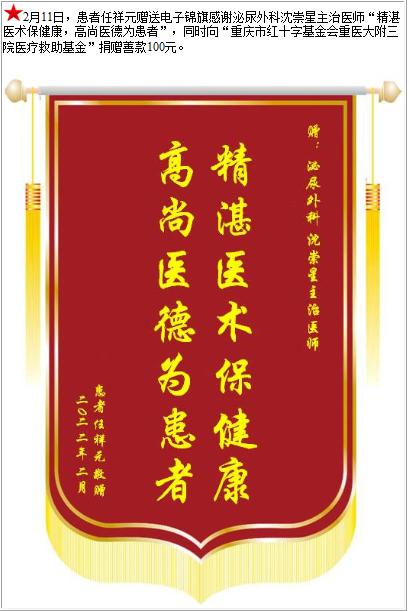 患者任祥元赠送电子锦旗感谢泌尿外科沈崇星主治医师,并向医疗救助基金捐赠善款100元-锦旗-患者心声-患者服务-重庆医科大学附属第三医院【官方网站】