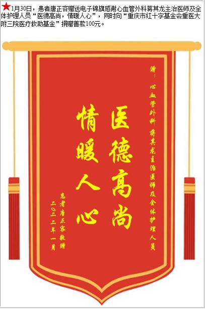 患者唐正容赠送电子锦旗感谢心血管外科蒋其龙主治医师及全体护理人员,并向医疗救助基金捐赠善款100元-锦旗-患者心声-患者服务-重庆医科大学附属第三医院【官方网站】