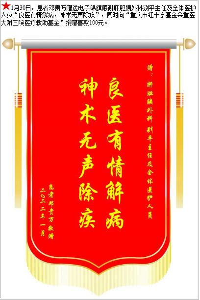 患者邓贵万赠送电子锦旗感谢肝胆胰外科别平主任及全体医护人员,并向医疗救助基金捐赠善款100元-锦旗-患者心声-患者服务-重庆医科大学附属第三医院【官方网站】