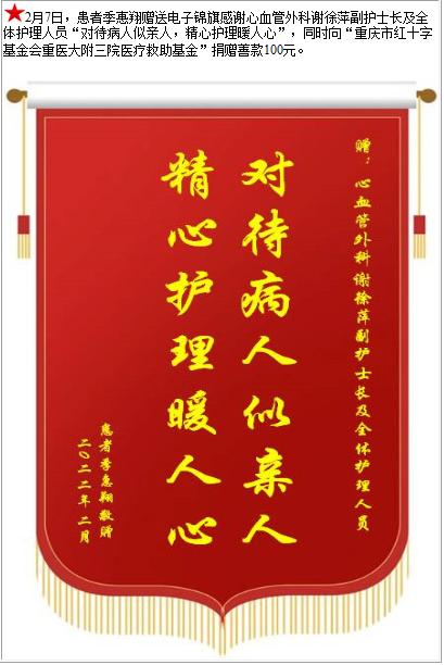患者季惠翔赠送电子锦旗感谢心血管外科谢徐萍副护士长及全体护理人员,并向医疗救助基金捐赠善款100元-锦旗-患者心声-患者服务-重庆医科大学附属第三医院【官方网站】