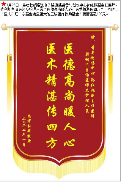 患者杜娟赠送电子锦旗感谢骨与创伤中心孙红振副主任医师等人及护理人员,并向医疗救助基金捐赠善款100元-锦旗-患者心声-患者服务-重庆医科大学附属第三医院【官方网站】