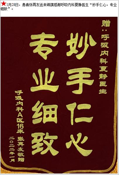 患者张再友送来锦旗感谢呼吸内科夏静医生“妙手仁心,专业细致”