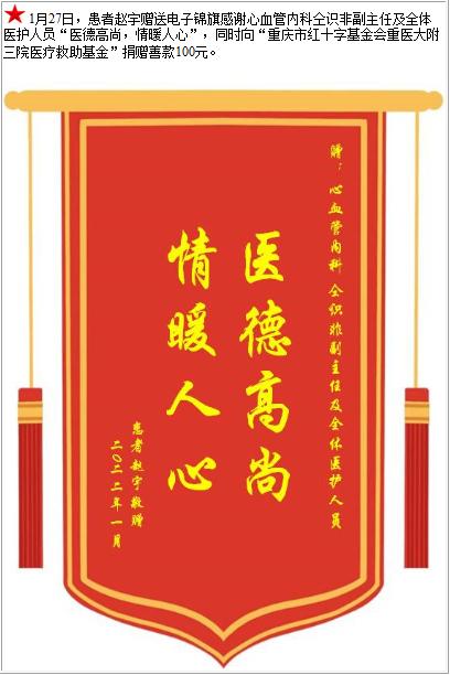 患者赵宇赠送电子锦旗感谢心血管内科仝识非副主任及全体医护人员,并向医疗救助基金捐赠善款100元-锦旗-患者心声-患者服务-重庆医科大学附属第三医院【官方网站】