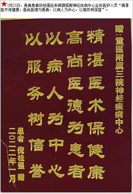 患者患者倪桂强送来锦旗感谢神经疾病中心全体医护人员“精湛医术保健康,高尚医德为患者,以病人为中心,以服务树信誉”-锦旗-患者心声-患者服务-重庆医科大学附属第三医院【官方网站】
