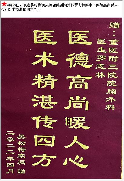 患者吴松梅送来锦旗感谢胸外科罗志林医生“医德高尚暖人心,医术精湛传四方”-锦旗-患者心声-患者服务-重庆医科大学附属第三医院【官方网站】