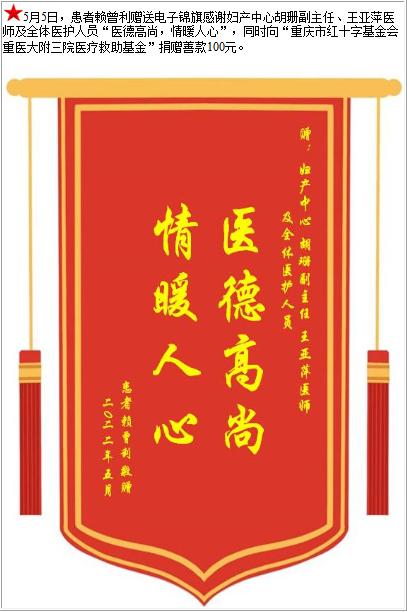 患者赖曾利赠送电子锦旗感谢妇产中心胡珊副主任等人及全体医护人员,并向医疗救助基金捐赠善款100元-锦旗-患者心声-患者服务-重庆医科大学附属第三医院【官方网站】