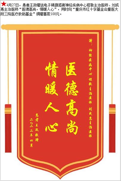 患者王政赠送电子锦旗感谢神经疾病中心程敬主治医师等人,并向医疗救助基金捐赠善款100元-锦旗-患者心声-患者服务-重庆医科大学附属第三医院【官方网站】