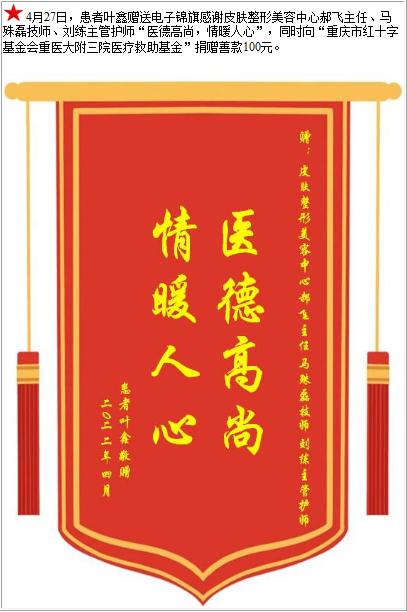 患者叶鑫赠送电子锦旗感谢皮肤整形美容中心郝飞主任等人,并向医疗救助基金捐赠善款100元-锦旗-患者心声-患者服务-重庆医科大学附属第三医院【官方网站】