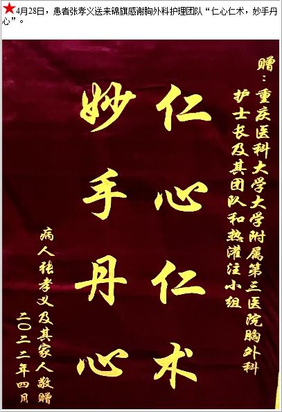 患者张孝义送来锦旗感谢胸外科护理团队“仁心仁术,妙手丹心”-锦旗-患者心声-患者服务-重庆医科大学附属第三医院【官方网站】