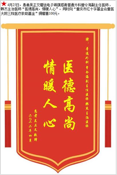 患者吴正文赠送电子锦旗感谢普通外科曾令海副主任医师等人,并向医疗救助基金捐赠善100元-锦旗-患者心声-患者服务-重庆医科大学附属第三医院【官方网站】
