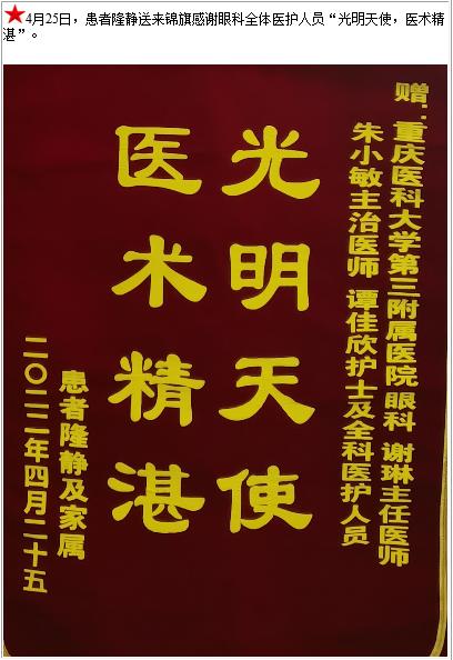 患者隆静送来锦旗感谢眼科全体医护人员“光明天使,医术精湛”-锦旗-患者心声-患者服务-重庆医科大学附属第三医院【官方网站】
