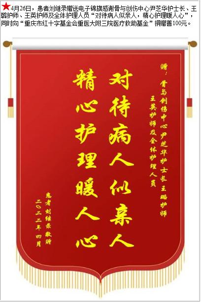 患者刘继录赠送电子锦旗感谢骨与创伤中心尹芝华护士长等人及全体护理人员,并向医疗救助基金捐赠善100元-锦旗-患者心声-患者服务-重庆医科大学附属第三医院【官方网站】