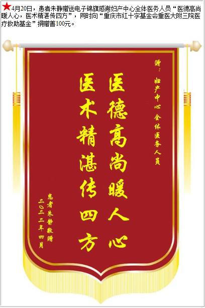 患者朱静赠送电子锦旗感谢妇产中心全体医务人员,并向医疗救助基金捐赠善100元-锦旗-患者心声-患者服务-重庆医科大学附属第三医院【官方网站】