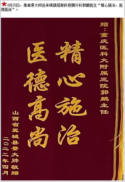 患者景大帅送来锦旗感谢肝胆胰外科郭鹏医生“精心施治,医德高尚”-锦旗-患者心声-患者服务-重庆医科大学附属第三医院【官方网站】