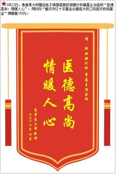患者景大帅赠送电子锦旗感谢肝胆胰外科曾磊主治医师,并向医疗救助基金捐赠善100元-锦旗-患者心声-患者服务-重庆医科大学附属第三医院【官方网站】