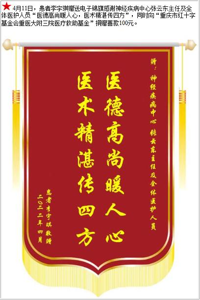 患者李宇琪赠送电子锦旗感谢神经疾病中心张云东主任及全体医护人员,并向医疗救助基金捐赠善款100元-锦旗-患者心声-患者服务-重庆医科大学附属第三医院【官方网站】