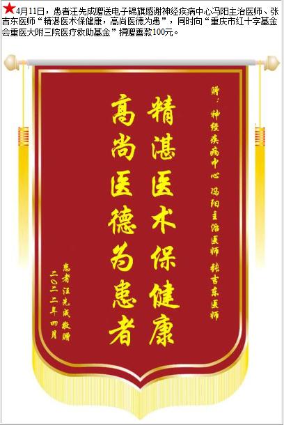 患者汪先成赠送电子锦旗感谢神经疾病中心冯阳主治医师等人,并向医疗救助基金捐赠善款100元-锦旗-患者心声-患者服务-重庆医科大学附属第三医院【官方网站】