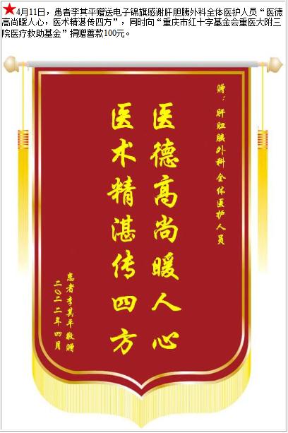 患者李其平赠送电子锦旗感谢肝胆胰外科全体医护人员,并向医疗救助基金捐赠善款100元-锦旗-患者心声-患者服务-重庆医科大学附属第三医院【官方网站】