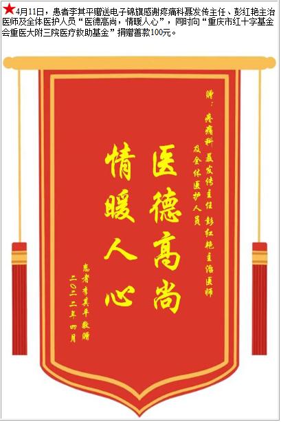 患者李其平赠送电子锦旗感谢疼痛科聂发传主任等人及全体医护人员,并向医疗救助基金捐赠善款100元-锦旗-患者心声-患者服务-重庆医科大学附属第三医院【官方网站】