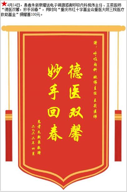 患者朱新泉赠送电子锦旗感谢呼吸内科姚伟主任等人,并向医疗救助基金捐赠善100元-锦旗-患者心声-患者服务-重庆医科大学附属第三医院【官方网站】