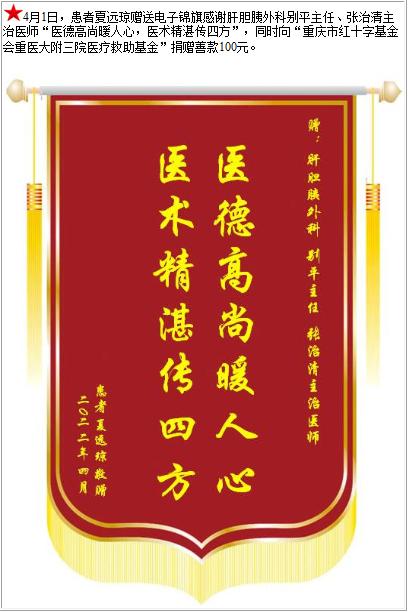 患者夏远琼赠送电子锦旗感谢肝胆胰外科别平主任等人,并向医疗救助基金捐赠善款100元-锦旗-患者心声-患者服务-重庆医科大学附属第三医院【官方网站】