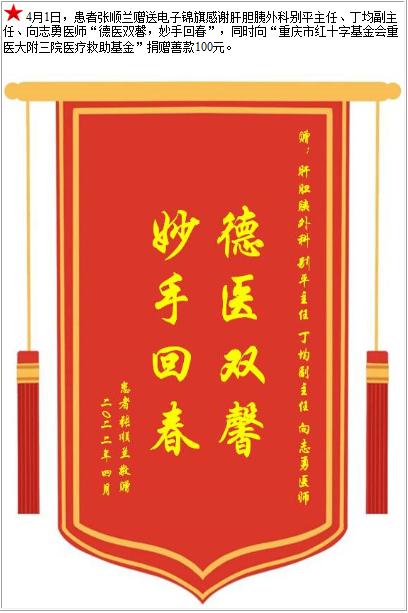 患者张顺兰赠送电子锦旗感谢肝胆胰外科别平主任等人,并向医疗救助基金捐赠善款100元-锦旗-患者心声-患者服务-重庆医科大学附属第三医院【官方网站】