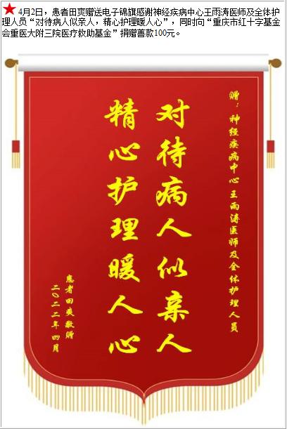 患者田爽赠送电子锦旗感谢神经疾病中心王雨涛医师及全体护理人员,并向医疗救助基金捐赠善款100元-锦旗-患者心声-患者服务-重庆医科大学附属第三医院【官方网站】