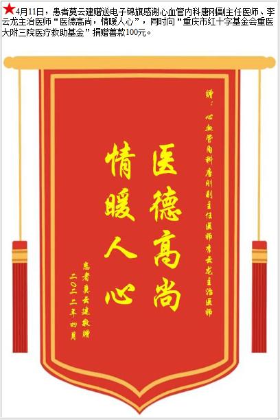 患者莫云建赠送电子锦旗感谢心血管内科唐刚副主任医师等人,并向医疗救助基金捐赠善款100元-锦旗-患者心声-患者服务-重庆医科大学附属第三医院【官方网站】