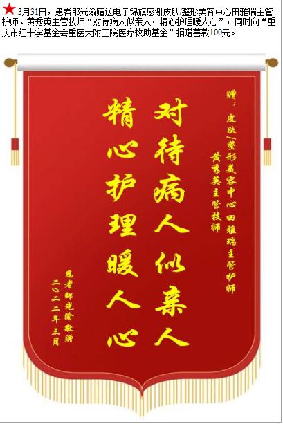 患者邹光渝赠送电子锦旗感谢皮肤/整形美容中心田雅瑞主管护师等人,并向医疗救助基金捐赠善款100元-锦旗-患者心声-患者服务-重庆医科大学附属第三医院【官方网站】